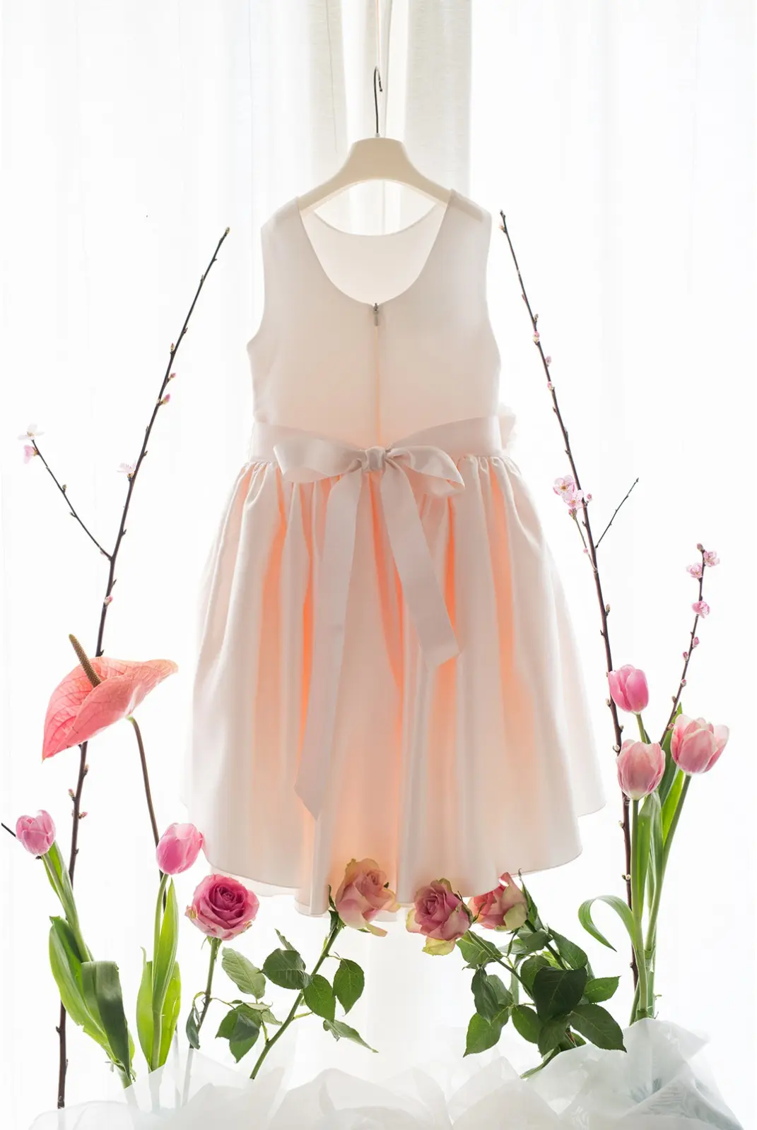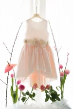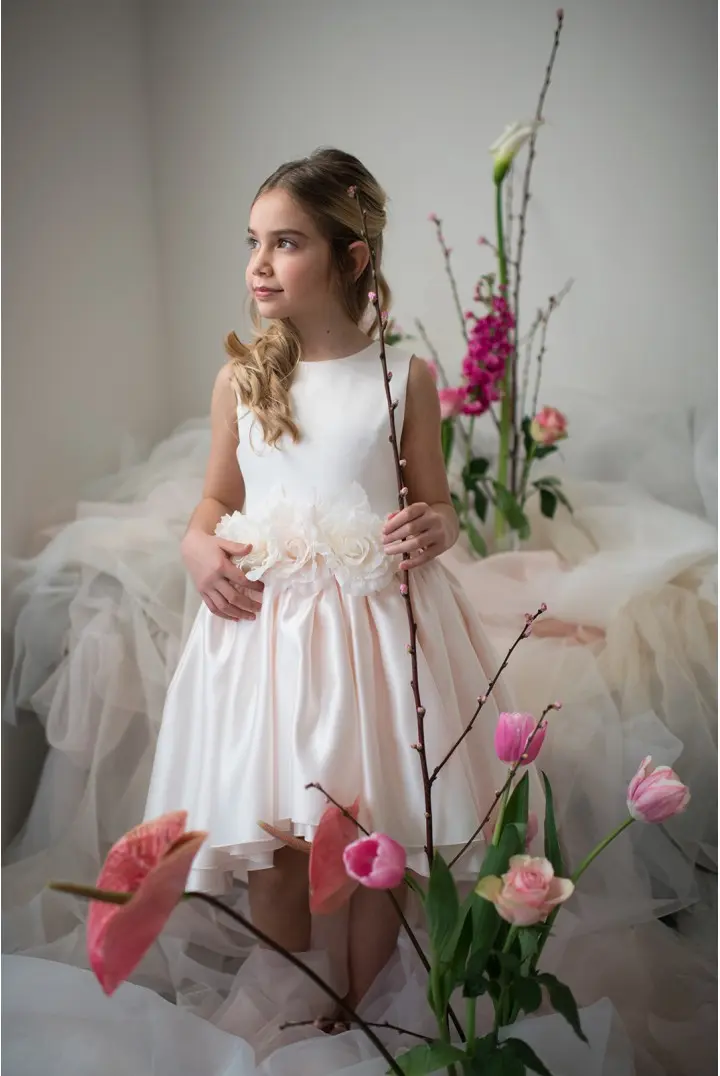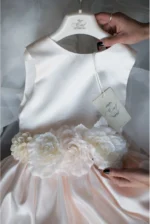 لباسی با برش کلاسیک که یقهی زیبا را در مرکز پنهان میکند. متشکل از یک دامن ساتن نامتقارن و یک کمربند فاخر که دور کمر را مشخص میکند، تزئین شده با گلهای رز بزرگ نقاشی شده با دست در سایههای عاجی و صورتی. آستر کامل از پنبه. زیپ راحت در پشت.