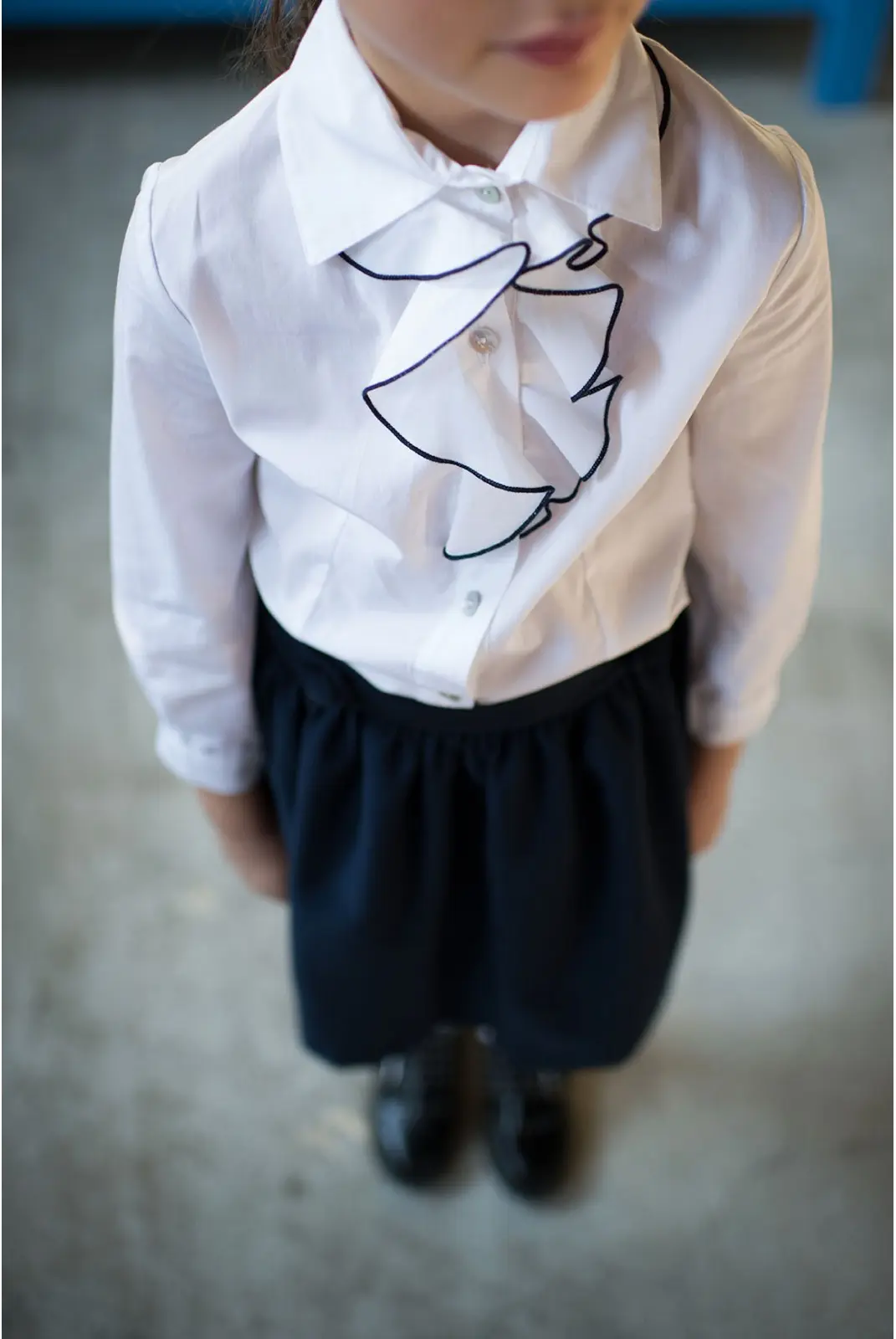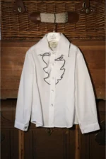 بلوز روچز با روکش آبی، یقه کلاسیک نوکتیز که با چینهای متضاد و جذاب غنی شده است. آستین با سرآستین و پنسهای دوتایی در جلو برای تناسب کامل. قد مدل: ۱۲۲ سانتیمتر. مناسب برای سایز ۶ سال